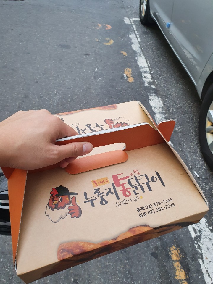 도착하자마자, 사장님이 기다렸다는듯이 바로 건네주셨다. 오.. 포장 박스가 일반 치킨집 박스랑은 다르다. 피자 박스 느낌?