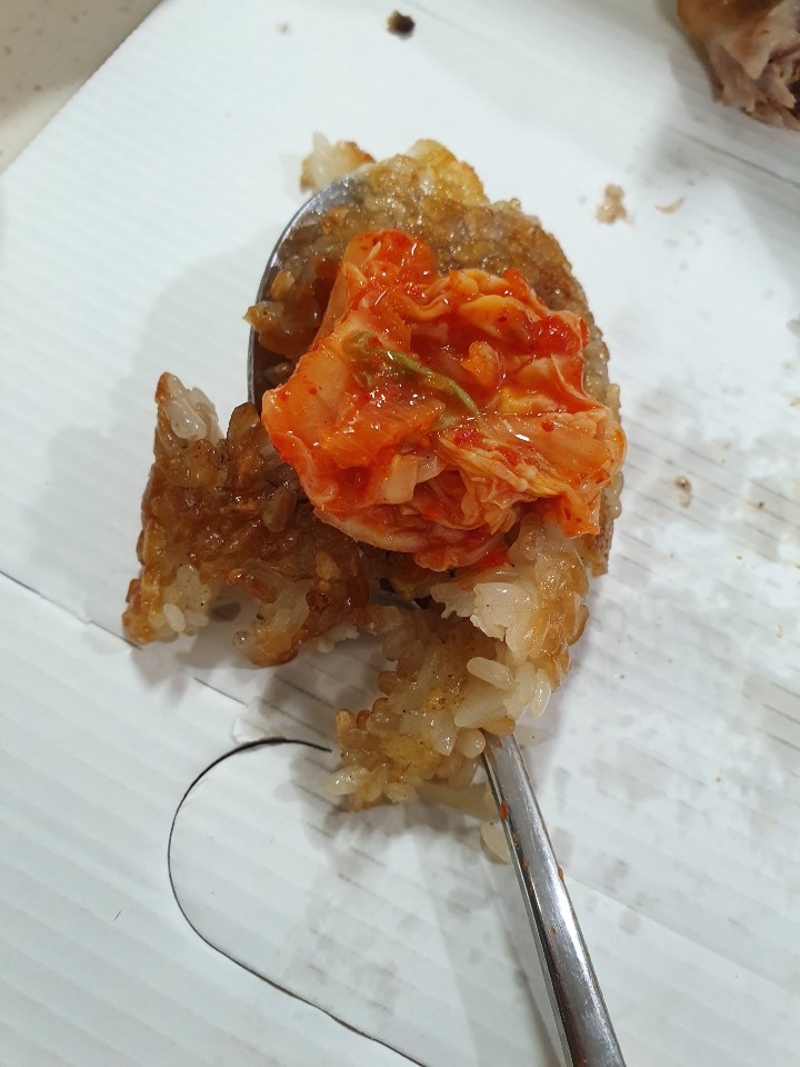 한입 베어물고 미쳤...! 왜 누룽지 통닭을 먹나 했던 내 편견이 와르르 무너짐...ㅋㅋ 겉바촉촉의 끝판왕이였고, 단백한 통닭에 양념소금, 겨자를 찍어먹으면 적당한 간이 되어 환상의 조합을 이뤄냈다
