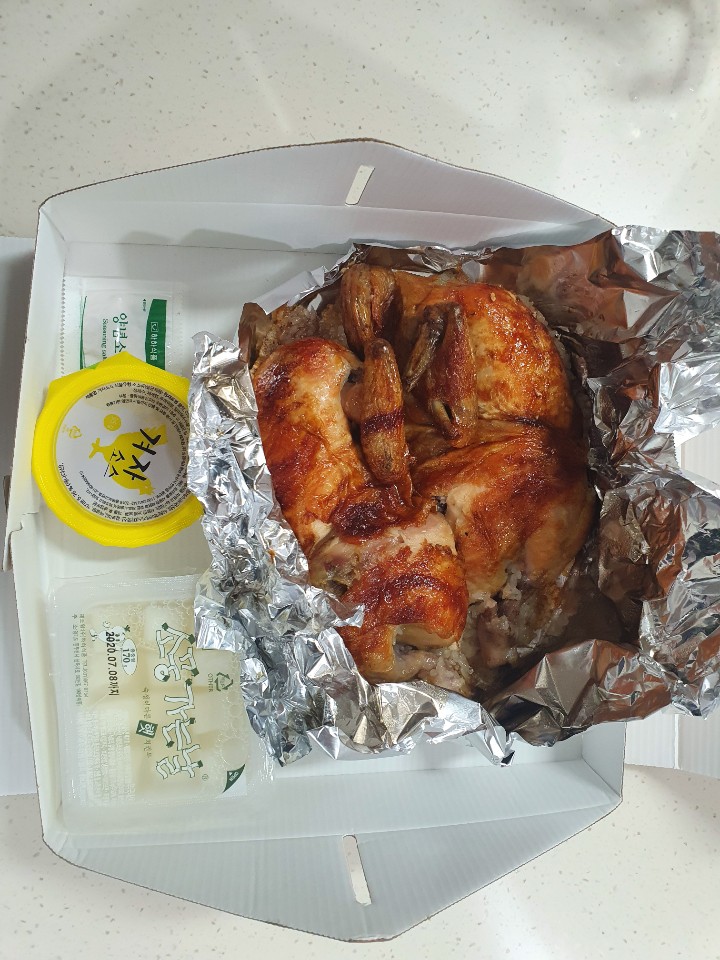 일단 치킨무, 겨자소스, 양념소금을 패키지로 주신다. 그리고 통닭 때깔은 무조건 합격!! 사실 인생에서 누룽지통닭 두번째 도전인데, 첫번째 도전은 치킨도 아닌것이 백숙도 아닌 느낌을 받았었다. 과연 이번엔..